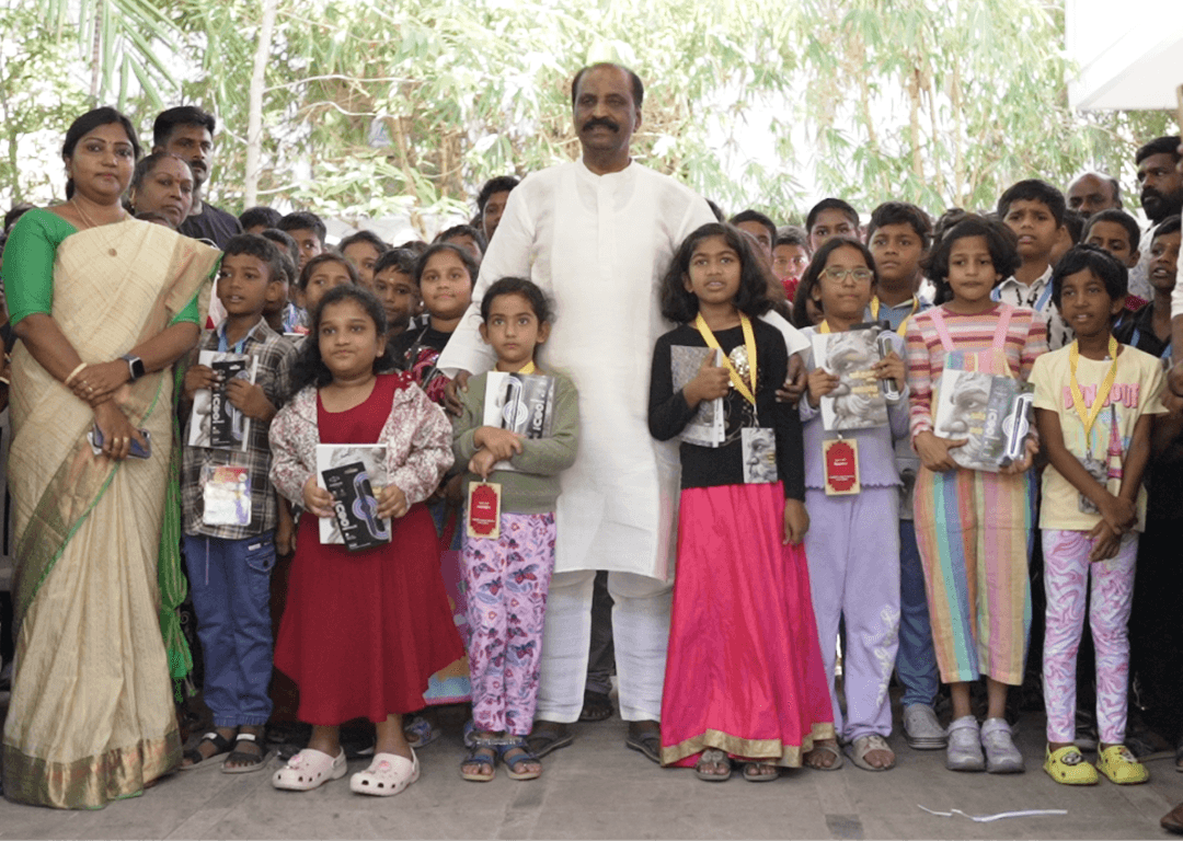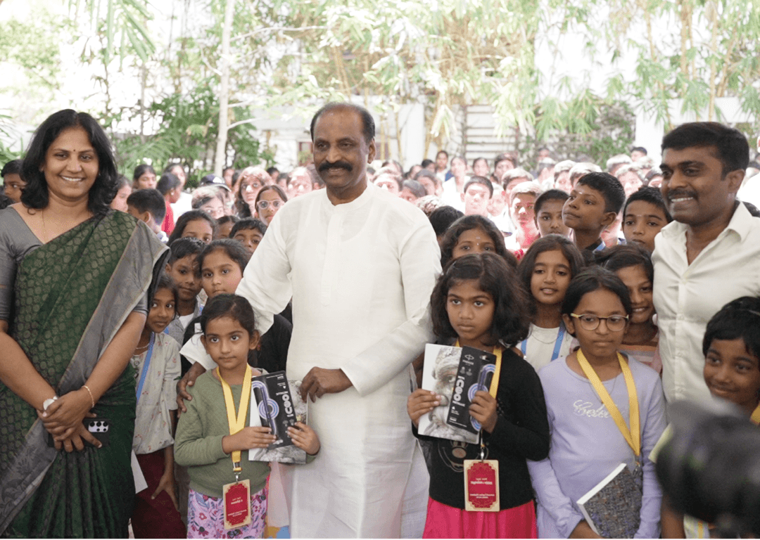 Another landmark initiative by Queen Mira was the extraordinary cultural exposure it created for 100 students from 10 Government schools across Madurai and Virudhunagar. These students were taken to Chennai to participate in “Valluvar Marai, Vairamuthu Urai,” an event hosted by the illustrious, award-winning Tamil poet and literary icon Kalaimamani Vairamuthu. The occasion was graced by the Hon’ble Chief Minister of Tamil Nadu, Thiru M.K. Stalin, and attended by distinguished Tamil scholars, revered cultural guardians, and passionate patriots who filled the hall with an atmosphere of pride and intellectual vibrance.This rare opportunity allowed young learners to witness Tamil heritage at its finest—an inspiring experience that deepened their cultural identity and broadened their aspirations.